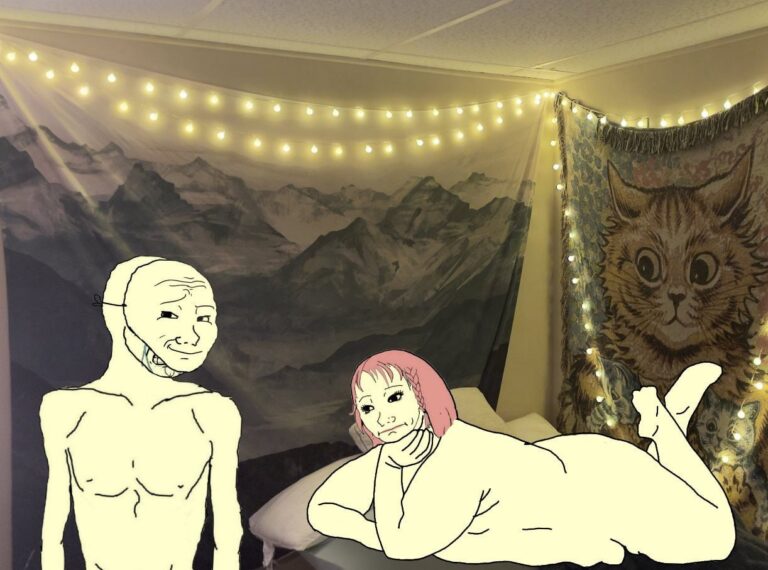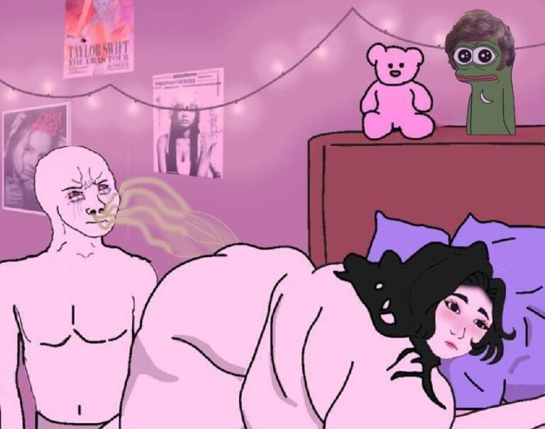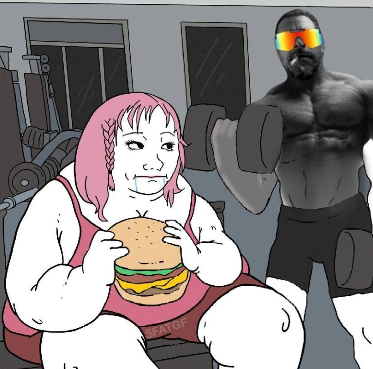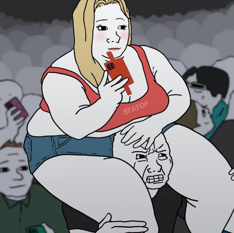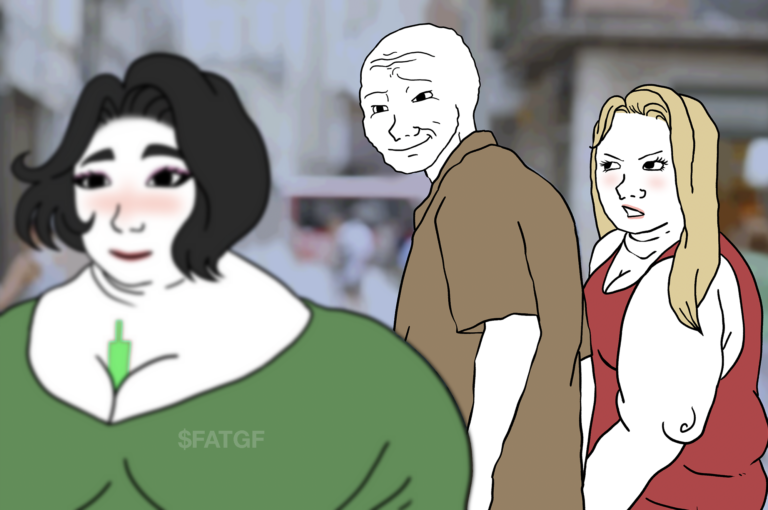 $BGF is inspired by the fat wojack girlfriend memes, a broadly appealing narrative where, whether out of desperation or attraction, a man bites off perhaps more than he can chew. While the memes may appear crude, they are actually a poignant commentary on modern society. On one hand, horny desperation, realized through the ubiquity of social media and modern dating culture. On the other, bravery in the face of social norms – an embrace of feminine confidence and a rejection of the thinspo culture that promotes body dysmorphia. Does he care that the woman is much larger than he? Perhaps, in fact, he likes it. Or, nihilistically, he doesn’t care one way or the other – he is motivated not out of desperation or attraction, but depression and anxiety. And what of the woman? The expression on her face says it all. Perhaps she settled long ago, resigned to mediocrity. But why? However you perceive it, the answer to one question determines whether you dine on fois gras or fish filet: can you handle all this woman?